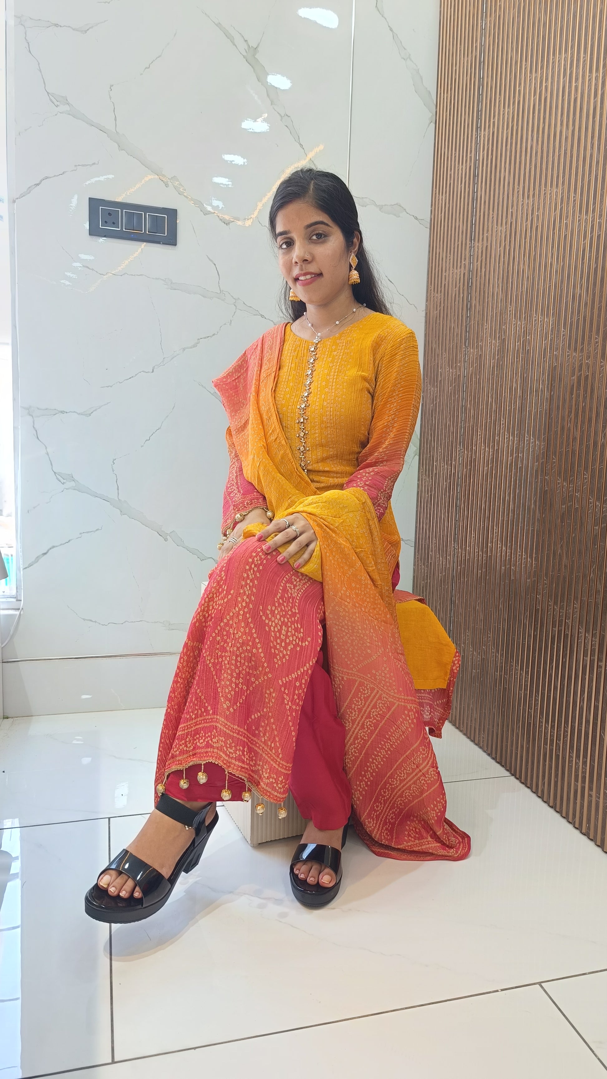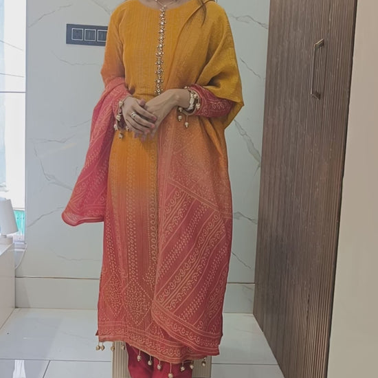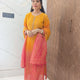 This yellow-red Chinnon suit set with dupatta is an elegant addition to your ethnic collection – stylish, comfortable, and perfect for every special occasion.