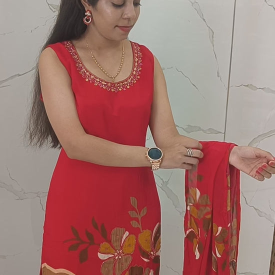 Embrace classic elegance with this women’s red Chinnon kurta set, designed with delicate handwork on the neckline and bodice. The soft Chinnon fabric lends a graceful fall, making this outfit ideal for wedding functions, family gatherings, and festive evenings.